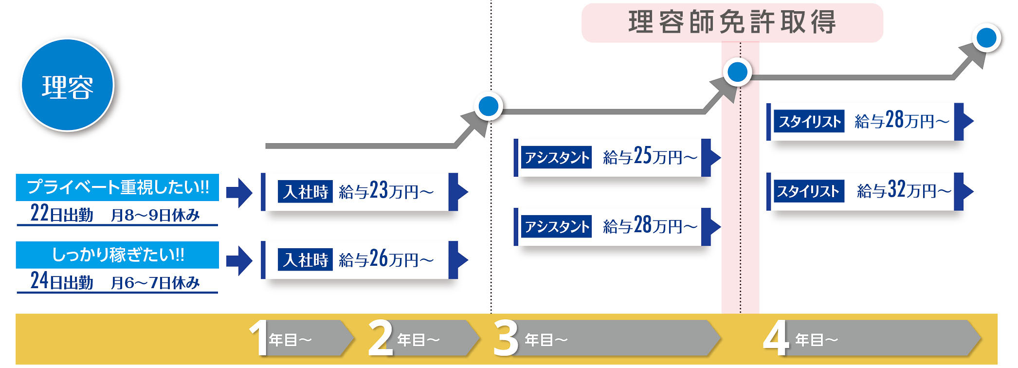 | 給 与 | 理容師/月給226,730円~+歩合(勤務地により異なります) 226,730円~320,000円以上 ※休日出勤をお願いする場合があります。休日出勤時は別途手当を支給いたします。 ※売上に応じて歩合が付く場合あり 限定勤務:1万1500円~1万4500円(土日祝+1000円/1日) |