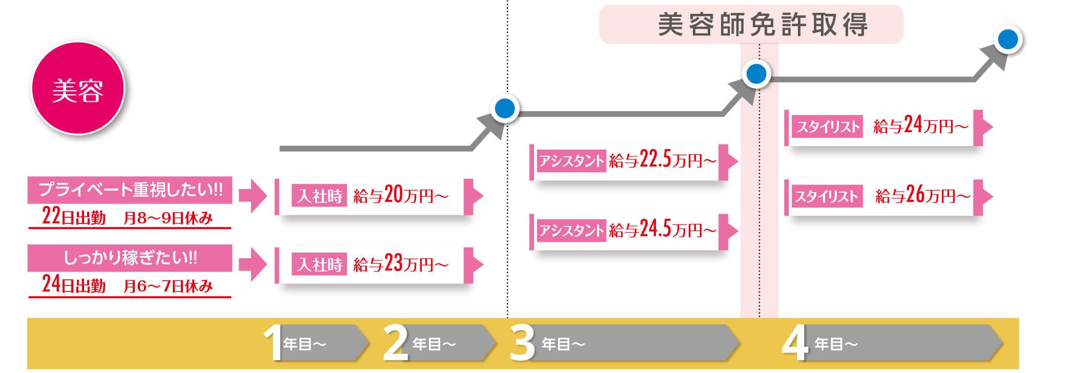 | 給 与 | 美容師/221,050円~ スタイリスト:233,850円~310,000円以上 アシスタント:221,050円~260,000円以上 ※休日出勤をお願いする場合があります。休日出勤時は別途休日手当を支給いたします。 限定勤務:日給10,500円~11,700円(勤務地により異なります) |